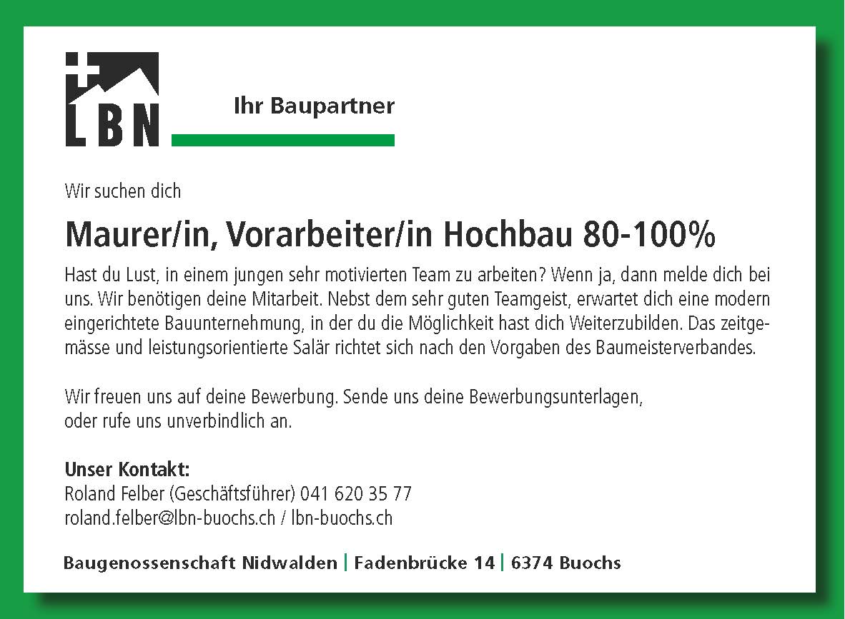Wir suchen Maurer/in, Vorarbeiter/in Hochbau 80-100%